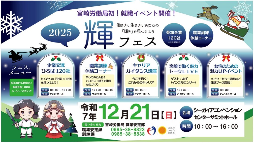 宮崎労働局主催の『「輝」フェス』宮崎県内企業就職支援イベントに参加します。